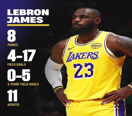 原以为,东契奇不在,詹姆斯说不定能冲一下本赛季的第一次30+,结果全场下来,詹姆斯投篮17中4,三分5中0,没有拿到一记罚球,只得到8分。