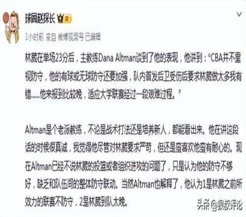 媒体人赵探长发文点评:Altman是个老派教练,不论是战术打法还是培养新人,都能看出来。他在讲这段话的时候很真诚,我觉得他尽管对林葳要求严苛,但还是蛮喜欢他蛮有耐心的。现在Altman已经不说林葳的投篮或者组织进攻的问题了,只是认为他的防守不够好,缺乏和队伍间的整体防守联动。当然Altman也解释了,他认为1是林葳之前所效力的联赛不防守,2是林葳到队太晚。